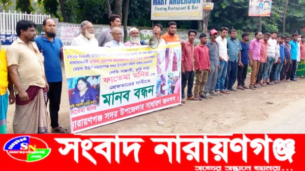 সংবাদ নারায়ণগঞ্জ:- পাগলায় জেলা পরিষদের সরকারি জায়গা দখলে বাধা দেওয়া লেডিস সন্ত্রাসী ফাতেমা মনিরের বাহিনীর হামলায় আহতের ঘটনায় ফাতেমা মনিকে গ্রেফতারের দাবিতে মানববন্ধন অনুষ্ঠিত হয়েছে। (২৮ সেপ্টেম্বর) বিকেলে পাগলা মেরি