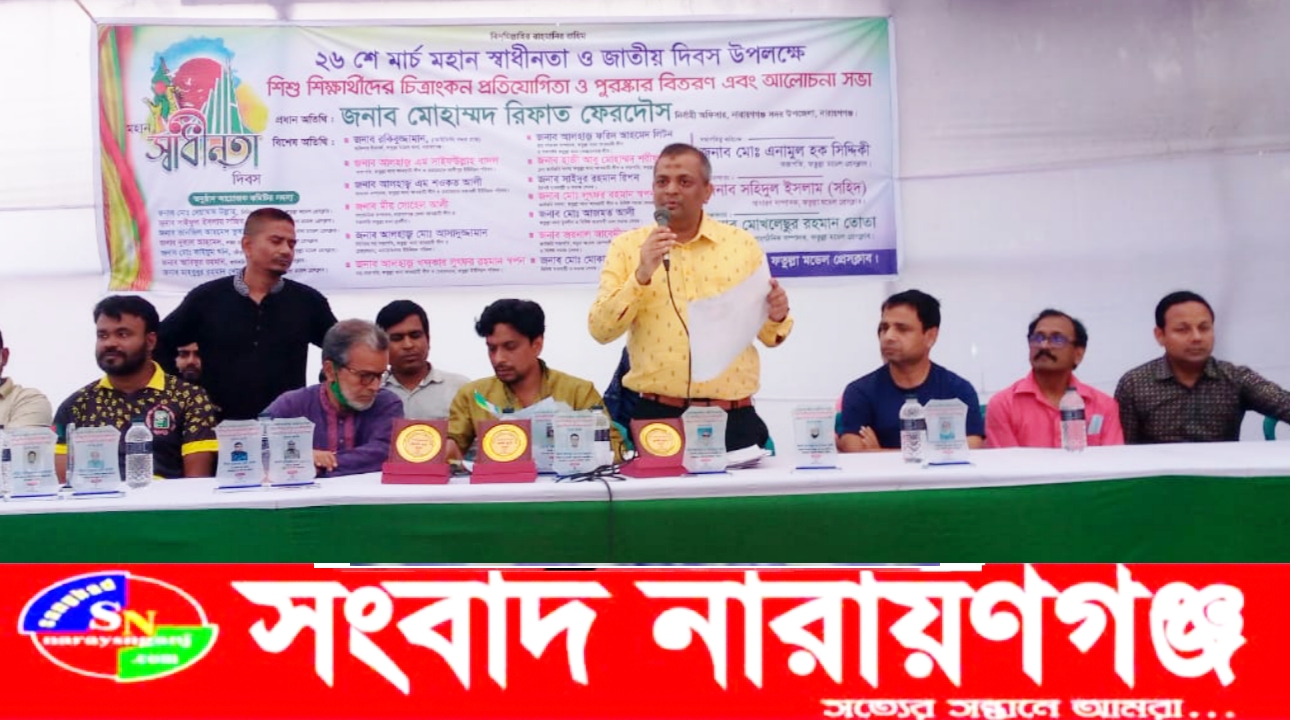 সংবাদ নারায়ণগঞ্জ:- মহান স্বাধীনতা দিবস উপলক্ষে ফতুল্লা মডেল প্রেস ক্লাবের উদ্যোগে শিশুদের চিত্রাঙ্কন প্রতিযোগিতা, পুরস্কার বিতরণ ও আলোচনা সভা অনুষ্ঠিত হয়েছে। রোববার ২৭ মার্চ বিকেলে ফতুল্লার যমুনা গেট সংলগ্ন বধ্যভূমিতে
