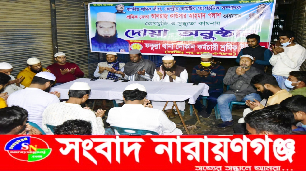সংবাদ নারায়ণগঞ্জ:- শ্রমিক নেতা আলহাজ্ব কাউসার আহমেদ পলাশের রোগমুক্তি ও দ্রুত সুস্থতা কামনায় আল্লাহর দরবারে শুকরানা আদায় করে দোয়া মাহফিল অনুষ্ঠিত হয়েছে। (৭ফেব্রুয়ারি) সোমবার বিকেলে ফতুল্লা গুদারাঘাটে ট্রলার বাল্কহেড শ্রমিক